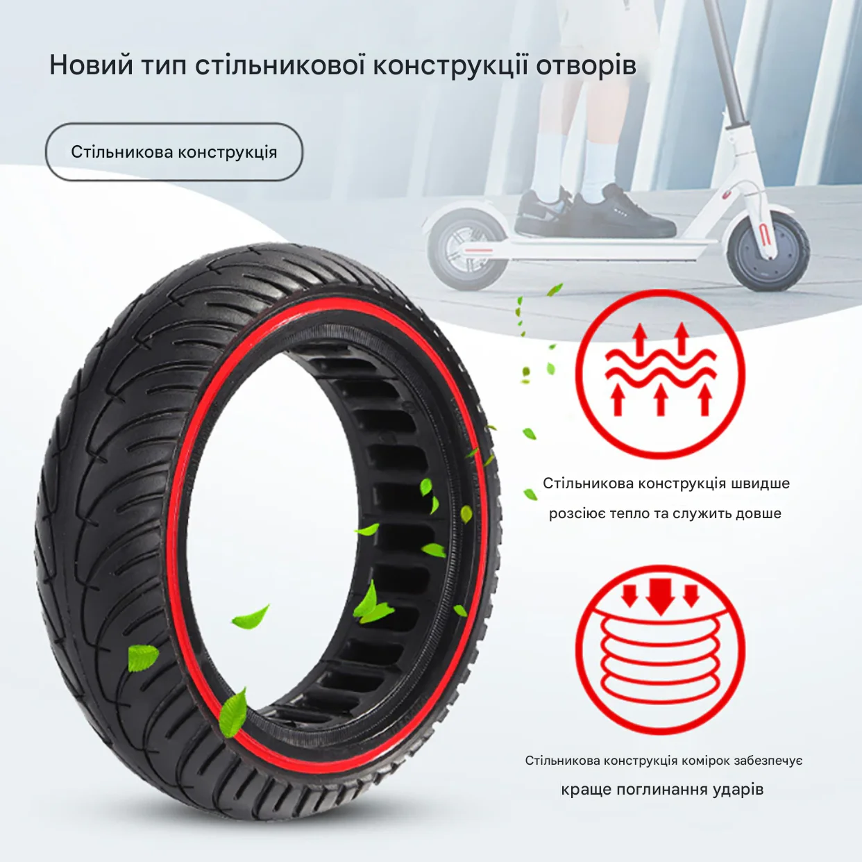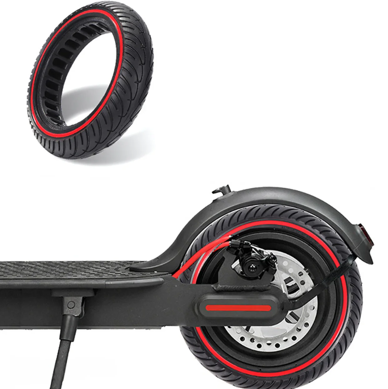 Эта бескамерная шина для Xiaomi M365 (а также моделей Pro, 1S, Essential) имеет уникальную перфорированную структуру. Специальные отверстия в корпусе выполняют роль амортизаторов, эффективно гася вибрации от неровного асфальта и плитки, что делает поездку значительно комфортнее по сравнению с обычными цельнолитыми покрышками.