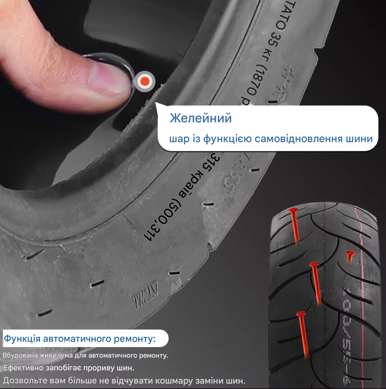- Надежная защита от проколов: Специальный гель внутри шины моментально запечатывает даже мельчайшие проколы, предотвращая потерю воздуха и обеспечивая непрерывное движение.